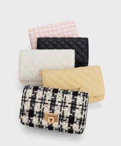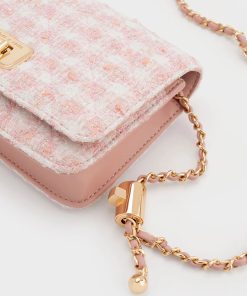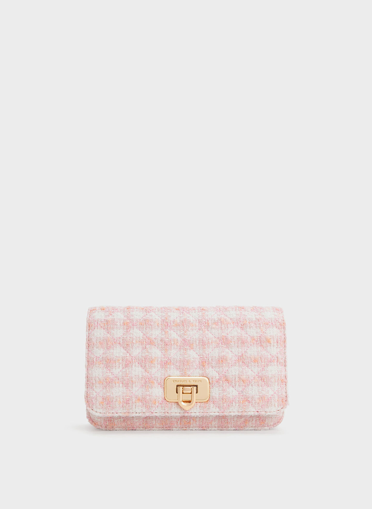 Uniquely textured and visually captivating, the Cressida clutch is designed for the fashion-forward individuals among us. With its checkered pink print and striking gold-tone hardware, this clutch exudes feminine elegance, allowing your personality and style to shine through. Carry it effortlessly in the palm of your hand or transform its look by attaching the chain strap, converting it into a crossbody or shoulder bag.